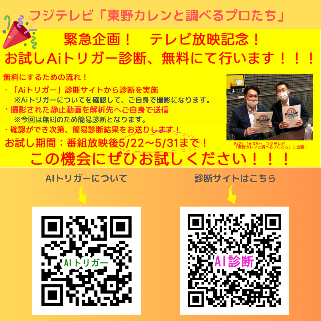 警察のウソ発見器や企業の採用などにも採用される「AIトリガー」は、多くのマスメディアに紹介されていて、今回もフジテレビ「東野カレンと調べるプロたち」に開発会社さんが出演されましたので、急遽ですが特別に無料診断が決定いたしましたので、ぜひお問い合わせください。