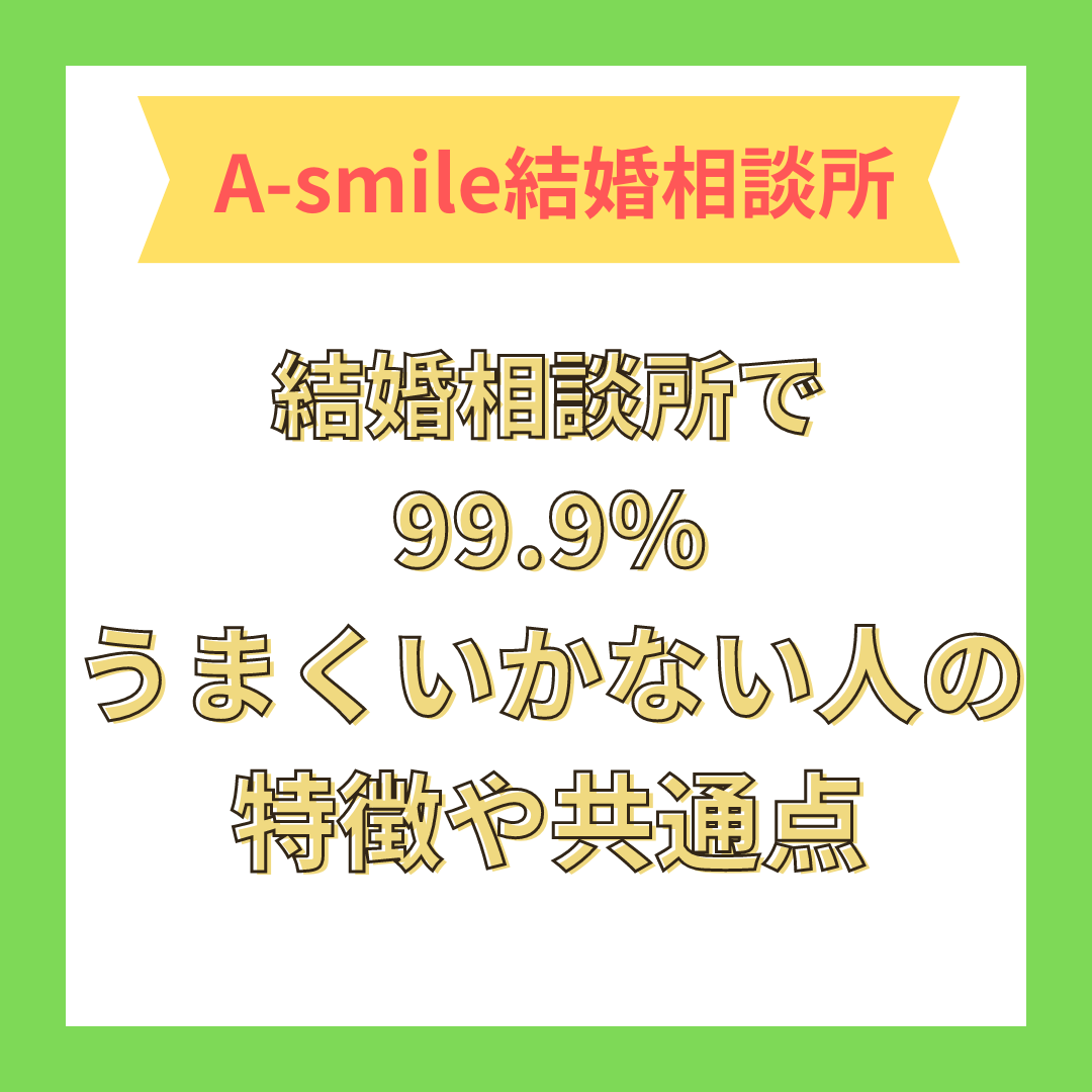 結婚相談所でうまくいかない人の特徴や共通点はいくつかあります。ぜひ参考にしてください。A-smileではお一人お一人の改善点をピンポイントでアドバイスいたします。よくある一般論のアドバイスでは同じ事の繰り返しになるだけなので、婚活に疲れてしまうのです。